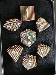 This is a review of the Colorful Striped pattern wooden dice. The good: These things are beautiful! The metal tin is well padded and the dice sit very securely in their places. The dice are light and the wood is smooth making them feel nice in your hand. The bad: The dice don't roll as well as my resin and metal dice. I love how these dice look. The stripes in the wood look great and the colors are vivid. They are smooth and have a nice feel when in my hand. When I roll them, however, the don't roll as well as resin and metal dice. I believe that it is because of their lighter weight. They are perfectly usable, but take a little getting used to. The dice are definitely a statement piece and I think they would make a nice gift. I actually have a large glass centerpiece on my table that is filled with dice and I plan on displaying these right at the top! At $36.99 (the price at the time of this review), I think they are reasonably priced as well.