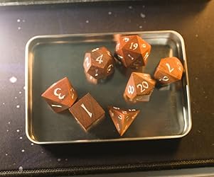 Box came in a little dented but the dice safe so the box did its job. The legends are engraved and have additional paint on them in a fantasy-esque font. I did a test roll of all the dice at the same time and my luck is not looking up!